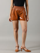 Sleek tan cruelty free faux leather with a high-shine finish for instant edge
